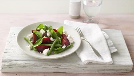 Toss the beans with the beetroot and spinach in a small bowl. Top with the cheese and serve.
