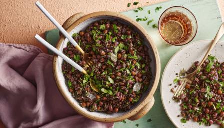 15 minutes and a raid of your store cupboard is all you need to make this hearty lentil and chickpea salad, dressed in an aromatic spiced tarka.