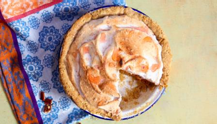 For the syrup, combine the orange juice and sugar in a saucepan and bring to the boil. Measure the temperature using a sugar thermometer and when it reaches 114C remove it from the heat. To decorate the pie, dip a fork into the caramel and carefully drizzle over the pie in a cross-hatch pattern (melted sugar is very hot – take care not to burn yourself). Serve the pie warm.