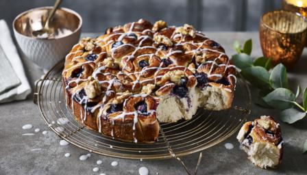 These delicious blueberry cinnamon rolls are baked snugly together in the tin to tear apart after being drizzled with icing and dotted with candied walnuts.