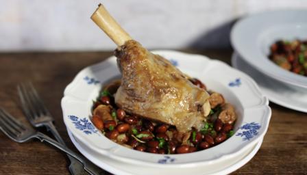 Braised lamb shank with bay and borlotti beans