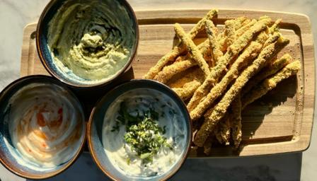 For the dips, mix the yogurt with each additional ingredient in separate bowls.