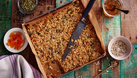 Meanwhile, tip the oats, seeds, nuts and apricots into a large bowl. Pour the hot syrup mixture over the oats and mix well to combine.
