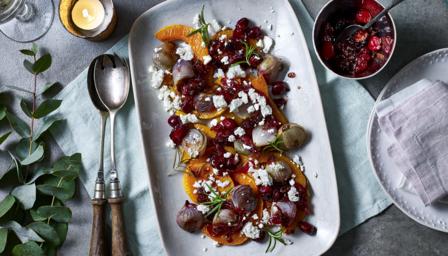 A delicious vegetarian starter or side for Christmas. All the elements – the date and cranberry relish, and the roasted squash – can be made ahead of time.