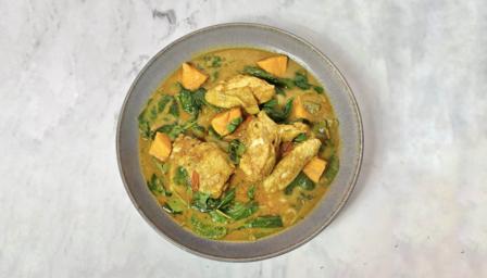 Carefully stir in the spinach and serve the curry in bowls with the coriander and basmati rice.