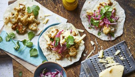 Assemble the tacos by arranging the warm tortillas on a plate or platter and topping with the onion salad and the cauliflower. Finish with the cheese and serve.
