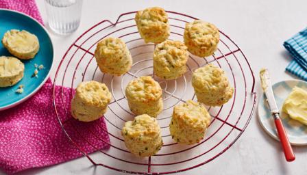 A crowd-pleasing savoury scone with cheddar and chives. They are very simple to make and it's great fun stamping out the circles of dough. Scones are best eaten fresh, but freeze very well once cooked, so any extras can be stored in the freezer for another day.