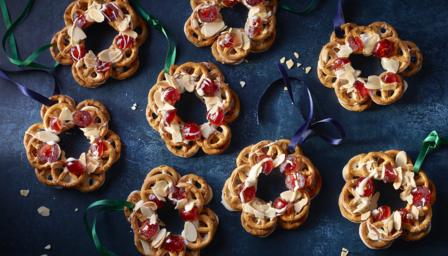 Cherry and almond chocolate pretzel wreaths