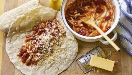 Divide the hot bean mixture between each tortilla, spooning down the centre of each one. Sprinkle the beans with the cheese, fold in the short ends of the tortillas and then the long ends to make two parcels. Turn over carefully and put on a plate or wrap in foil to eat. Serve warm.