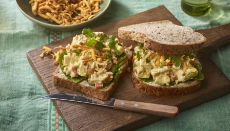 Spoon onto slices of bread or green salad before sprinkling generously with chopped coriander. Sprinkle with Bombay mix for added crunch, if you like.