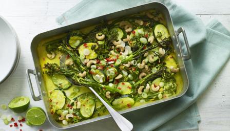 This light, refreshing vegan traybake with fresh summer vegetables and spiced coconut milk is perfect to serve with noodles or rice. Use your preferred green vegetables – I love the combination of Tenderstem broccoli with courgette, but you could use asparagus and sugar snap peas instead.