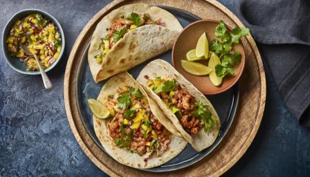 To serve, layer up the tacos with coleslaw first, followed by prawns and finished with the mango salsa.