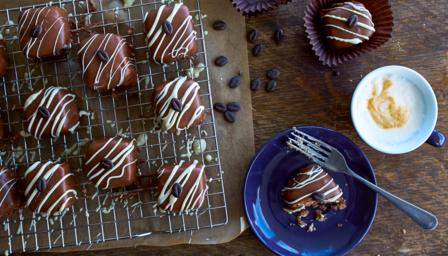 When set, carefully lift the fancies from the cooling rack with a large offset palette knife. Decorate the top of the fancies with a swirl of buttercream, piped lines of white chocolate or chocolate coffee beans, as desired.