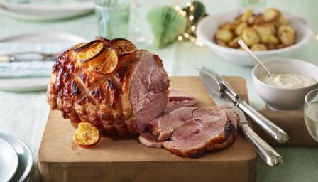 Delicious glazed ham, served hot or cold, is a treat for any Christmas celebration. Serve with a creamy mustard sauce and golden, garlicky roasted new potatoes.