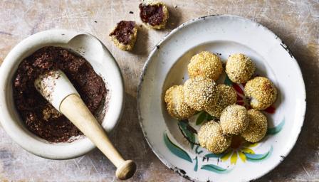 These chewy chocolate balls are great as a treat and the filling in the middle can be adjusted to include any variety of nuts or spices.