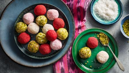 Now comes the exciting part: roll the white and pink coconut balls into either the freeze-dried strawberry powder, desiccated coconut, or toasted pistachios to create a selection of different coloured sweets.