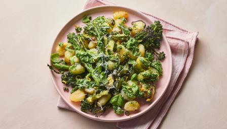Courgette, broccoli and gnocchi traybake with spring greens pesto