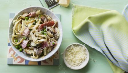 Drain the pasta and peas and return to the saucepan. Add the cream and the bacon mixture to the saucepan and place over a low heat. Toss the mixture with a couple of forks for a few seconds until the cream is hot and everything is well mixed. Sprinkle with the Parmesan and serve immediately.