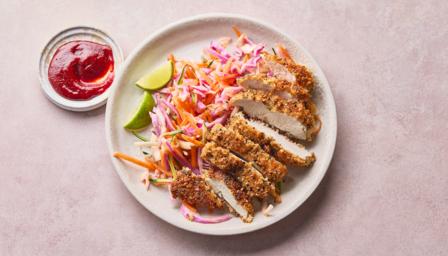 Crispy fried chicken with gochujang sauce and slaw