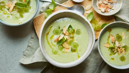 4. Serve in bowls and top with chopped grapes, toasted almonds or shredded basil. Alternatively serve in chilled shot glasses.