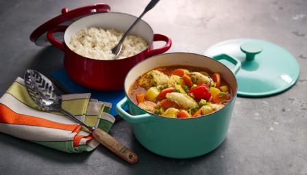 Serve the chicken curry with the coconut rice.