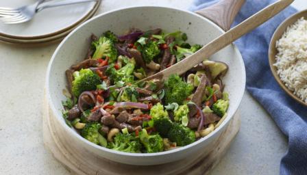 Stir the cooked beef and cashews through the sauce and heat for a minute. Scatter over the chilli and coriander and serve immediately with the drained rice.