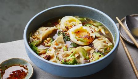 When the gyoza are cooked, use a slotted spoon to scoop them and the broccoli into the noodle bowl. Top with as much of the cooking water as you like, mix well and serve.