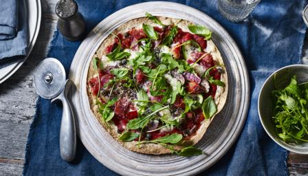 Bake for 10–12 minutes, or until the cheese has melted and started to turn golden-brown. Cut the pizzas into wedges and scatter over the basil and rocket leaves to serve.