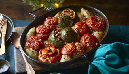 These traditional Greek stuffed vegetables make a delicious vegetarian main. Make them the day before and then reheat for maximum flavour.
