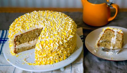 This light, fluffy, sponge is delicate and delicious. Don’t be put off by the piping; it’s incredibly forgiving and very easy to get a striking effect.
