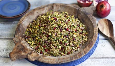 Freekeh is dried green wheat, harvested while the grains are still soft, then sun-dried. It is very common in the Middle East and North Africa, and is used in the same way as bulgur, couscous or pearled spelt. It works well as an accompanying pilaf or a salad, in this case with pomegranate seeds, pistachios, mint and spring onion.