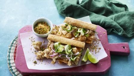 Nadiya’s take on the Louisiana po’ boy uses fried chicken instead of the more traditional shrimp. Topped with fresh cucumber and spicy coconut sambal, they’re a taste sensation.