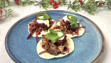 To serve, spoon some red cabbage into a crisp taco. Add some meat, followed by the cranberry relish and a dot of soured cream. Garnish with some jalapeño slices and coriander.