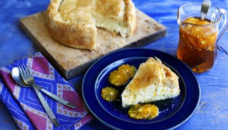 Allow the pie to cool to room temperature before releasing from the tin. Cut into slices using a serrated knife and serve with the oranges in syrup.