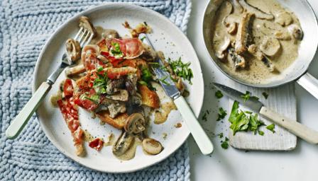 Place a slice of toasted brioche on each plate, spoon over some of the garlic mushrooms, followed by a slice of fried ham and a sprinkling of chopped parsley. Serve immediately.