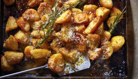 Spoon the fragrant oil over the roast potatoes and toss to coat. Finish with lots of grated Parmesan and serve.