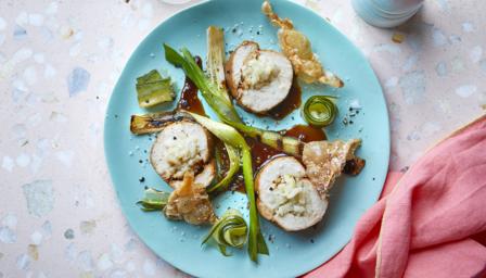 Inspired by the Filipino national dish, adobo, a stew fragrant with vinegar, garlic and soy sauce, the chicken breasts are stuffed with garlic risotto and served with adobo glaze, pickled cucumber, charred spring onions and crispy chicken skin.