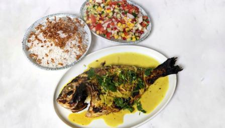 Grilled fish with coconut, lemon and turmeric sauce