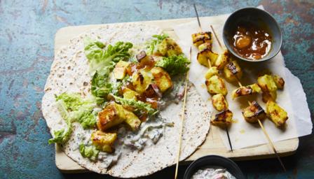 Choose your curry powder heat for this easy grilled halloumi skewers and then cool it down with a minty raita and sweet mango chutney. Serve with crispy oven chips for a fantastic weeknight treat.
