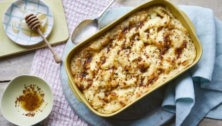 Take your mashed potato to the next level with this creamy, cheesy baked version topped with a honey mustard dressing for ultimate comfort food vibes. A dream come true with sausages.