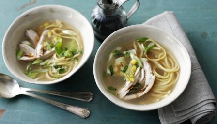 Add the noodles to the chicken stock and cook for a minute before adding the chicken, bok choi, spring onion, sweetcorn and soy sauce to the pan. Cook for 2-3 minutes, then stir through the chopped coriander.