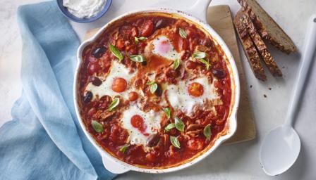 Take your baked eggs to another level with tuna, olives and capers. Serve with multigrain bread for a filling dinner.