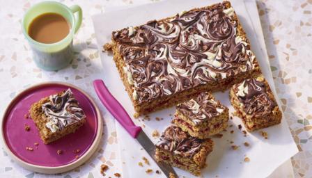 These jam layer flapjacks are Nadiya’s version of the Bakewell flapjack: buttery sweet, flavoured with almond, with a raspberry jam layer and a marbled chocolate topping.