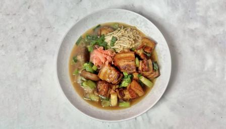 Pile the glazed pork into the bowls, garnish with the spring onion green tops and pickled ginger and serve.