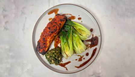This dinner is quick and simple to make but packed with Asian flavours, from the spicy salmon to the ginger bok choi and cucumber pickle.