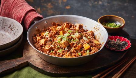 Mapo tofu is traditionally a Chinese dish, but it's been given a Korean twist here with spicy gochujang and doenjang pastes.