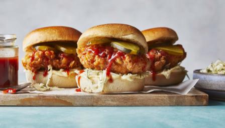 This decadent Korean fried chicken burger is made with a lovely spiced coating (with the option of using cornflakes for extra crunch!). Serve with buttery Korean sauce and slaw.