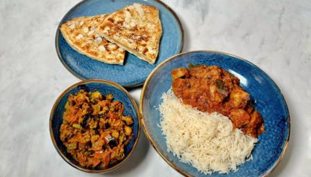 Cook up an Indian feast of lamb madras inspired by Gandhi’s restaurant in Kennington. Served with okra bhindi and fluffy homemade peshwari naan breads.