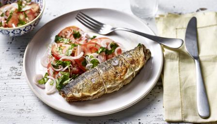 To make the salad, layer the ingredients in a large shallow dish, starting with the tomato, then the shallot, coriander, cumin and cayenne. Sprinkle over the vinegar, then some salt. Don't mix it up, just leave it to stand while you cook the fish.