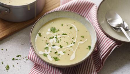 A silky potato soup garnished with a swirl of cream and a little parsley. It's budget food that feels indulgent.